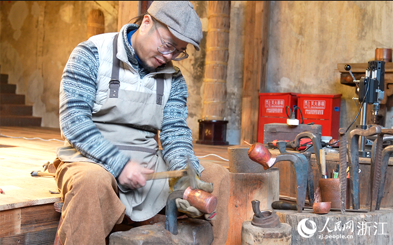 “鐺鐺鐺……梆梆梆……”江南小院內,伴隨著雨滴拍打磚瓦的滴答聲,“麻雀夫婦”烤茶店老板老麻正一手拿著一把十幾公分的錘頭,一手將一只銅杯固定在案頭,有節奏地敲打著。不一會兒,起初歪歪扭扭的杯口被捶打得嚴絲合縫。