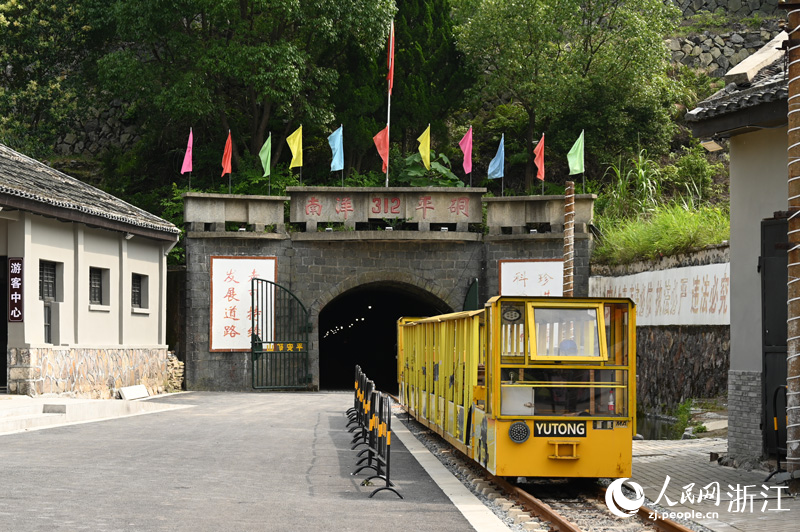 在雞籠山北坡上,有一座南洋312平硐,這里曾是溫州礬礦的主采礦區,因為硐內外的空氣進行對流,硐內常年恒溫18℃,如今是當地村民避暑的好去處。為方便游客參觀、考察,312平硐里安裝了燈光裝置,2022年底,這里又增設了可進入硐內的黃色漆皮小火車,游客可戴上安全帽,乘坐小火車游覽礦硐與三車間煅燒爐,在專人引領下,一探礦石開采的秘密。2023年“五一”期間,僅小火車的門票收入就達到了一天近萬元。