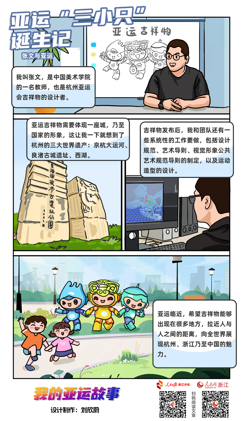 它們是如何被創作出來的?各自都有哪些寓意和特點?人民網浙江頻道采訪了杭州亞運會吉祥物設計者、中國美術學院專業基礎教學部教師張文,聽他講述亞運“三小只”誕生記。