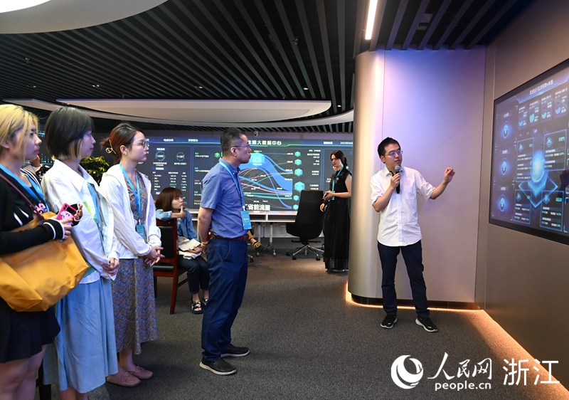 “你好,碳中和”主題調研團隊在杭州能源大數據評價與應用研究中心聆聽關于“杭州市能源雙碳數智平臺”的講解。人民網 方彭依夢攝