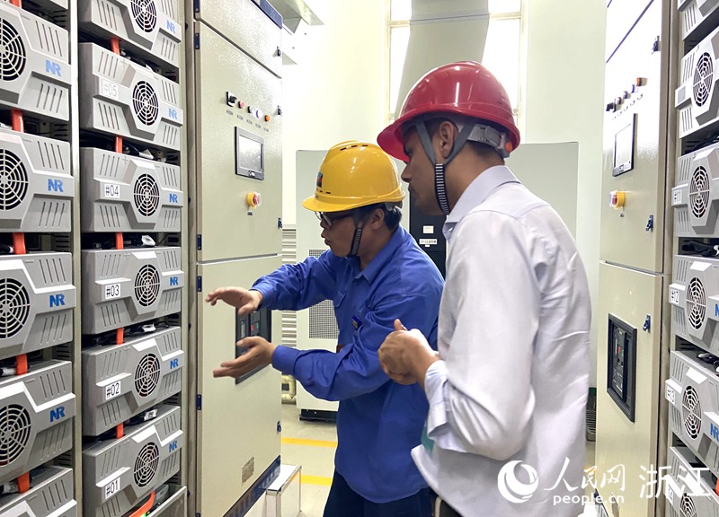 蕭山發電廠工作人員正在為調研團隊成員進行講解。人民網 方彭依夢攝