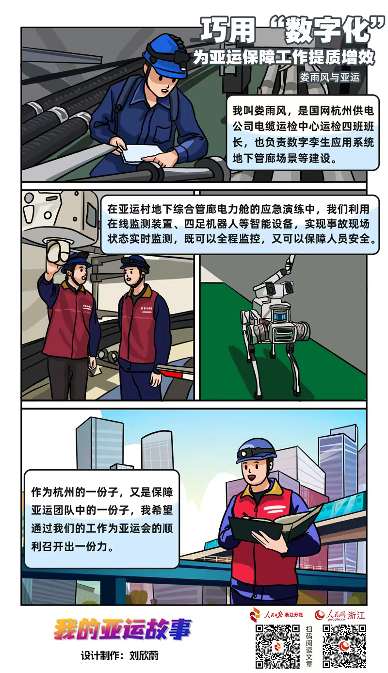 婁雨風告訴記者,在這次亞運會的保障工作中,他主要負責公司亞運電纜監控中心建設、數字孿生應用系統地下管廊場景建設、四足機器人智能巡檢系統建設等工作,開展電纜隧道及綜合管廊電力艙“無人巡視,智慧運檢”體系建設,為保障杭州亞運會順利舉辦添磚加瓦。