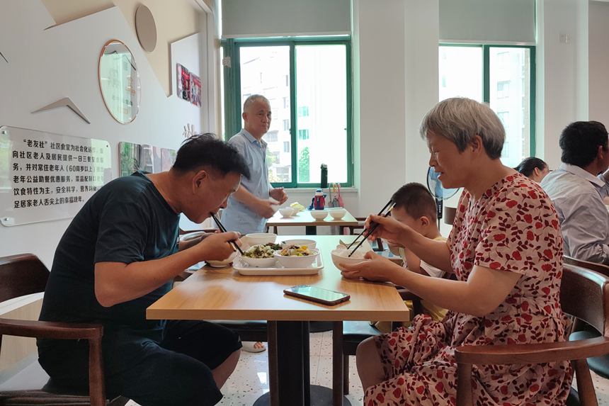 結束上午的表演課,嚴薔珠約上3位老姐妹,一起在社區新開業的“老友社·老味道”食堂聚餐。清蒸鰻魚、肉餅蒸蛋……“有了食堂,我們能輕松吃上物美價廉的飯菜了?!眹浪N珠說。