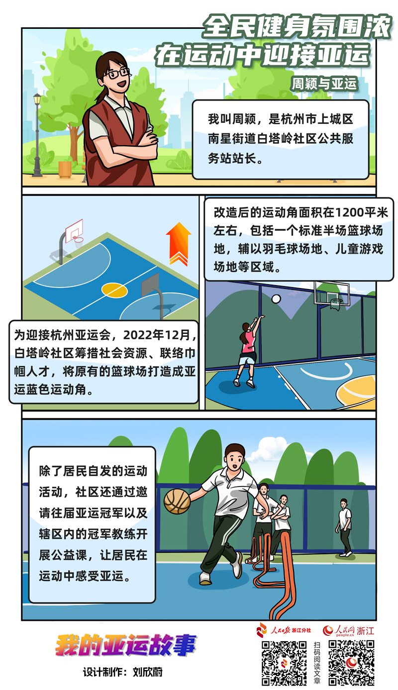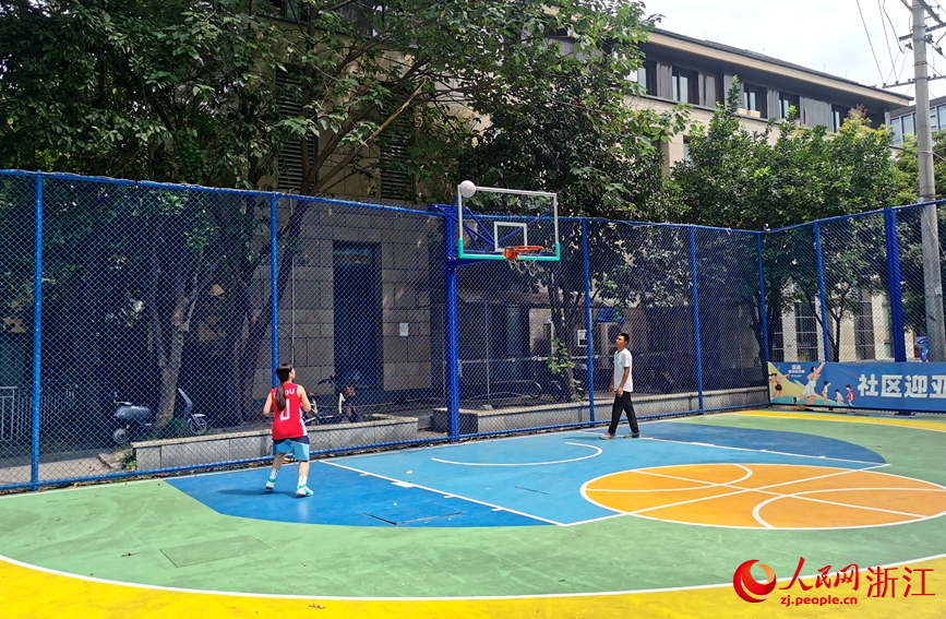 “以前這里比較破舊,運動配套也不完善,比如馬路邊的籃球場沒有網框,球很容易誤傷行人?!卑姿X社區公共服務站站長周穎介紹,為迎接杭州第19屆亞運會,號召人人參與亞運,營造全民健身的亞運氛圍,2022年12月,白塔嶺社區籌措社會資源、聯絡巾幗人才,聯系了螞蟻公益基金會、杭州市亞組委等外展資源,對原有的籃球場進行升級改造,升級成一處亞運藍色運動角。