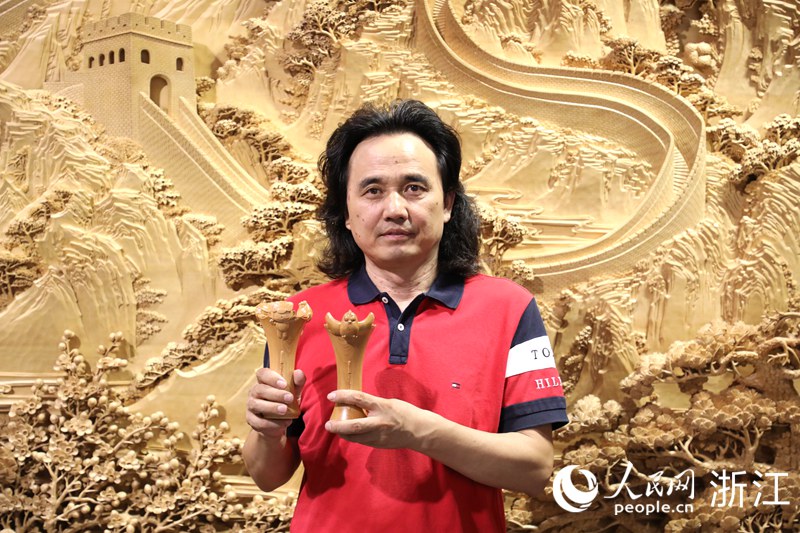 國家級非遺東陽木雕代表性傳承人黃小明手捧杭州亞運會頒獎花束花器部分(過程版)。人民網 方彭依夢攝