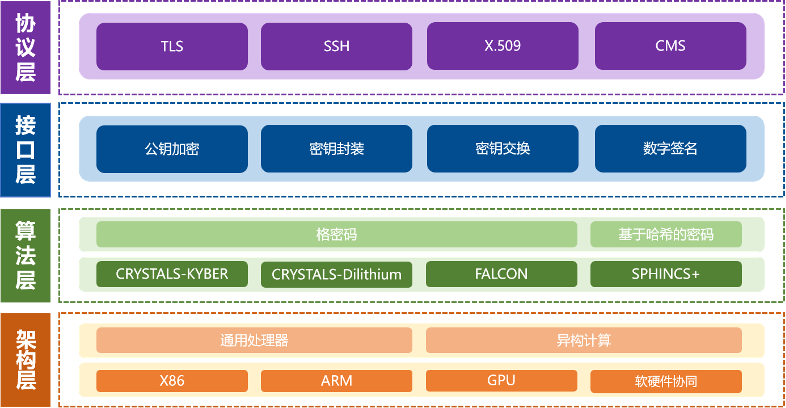 密碼是網絡安全的基礎,在后量子時代,量子計算機能夠快速破解現有的RSA、橢圓曲線等傳統公鑰密碼算法,而量安科技正在做的,就是對現有的密碼算法進行升級、遷移,保障其在后量子時代的安全性。