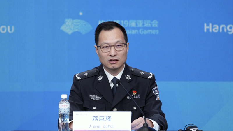 浙江省公安廳交通指揮中心主任蔣巨輝介紹杭州亞運會火炬傳遞運行階段安全保障情況。方建飛攝