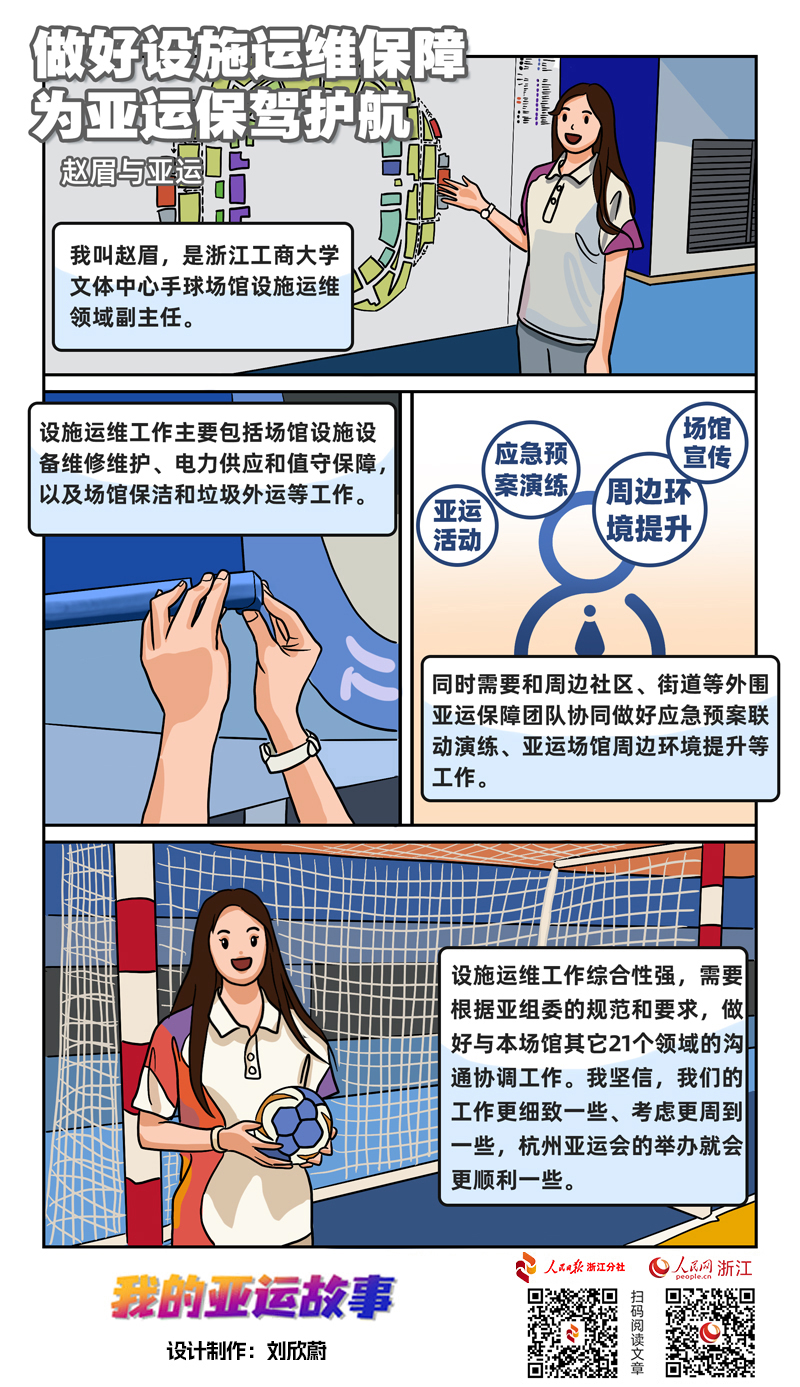 在近20米高的馬道,在橋架穿梭的吊頂,在轟鳴聲響的機房……在杭州亞運會手球場館六萬五千余平方米的角角落落,都有著趙眉的身影。她是浙江工商大學文體中心手球場館設施運維領域副主任,也是亞運場館周邊社區的對接人。