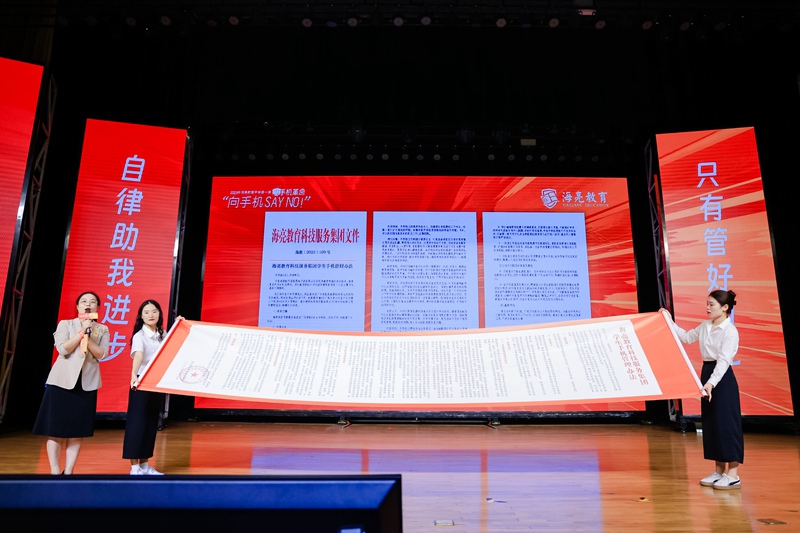 “我承諾,自覺遵守校紀校規,絕不違背手機管理規范;主動擁抱現實生活,強身健體培養高雅志趣……”9月2日上午,浙江諸暨海亮教育園傳來近千名學生的宣誓聲。這一堂由海亮教育科技服務集團領銜、旗下超160所自有及服務學校共同參與的開學第一課“向手機SAY NO!”正式啟動,吸引了近千名學生代表、家長代表及各界專家參與。