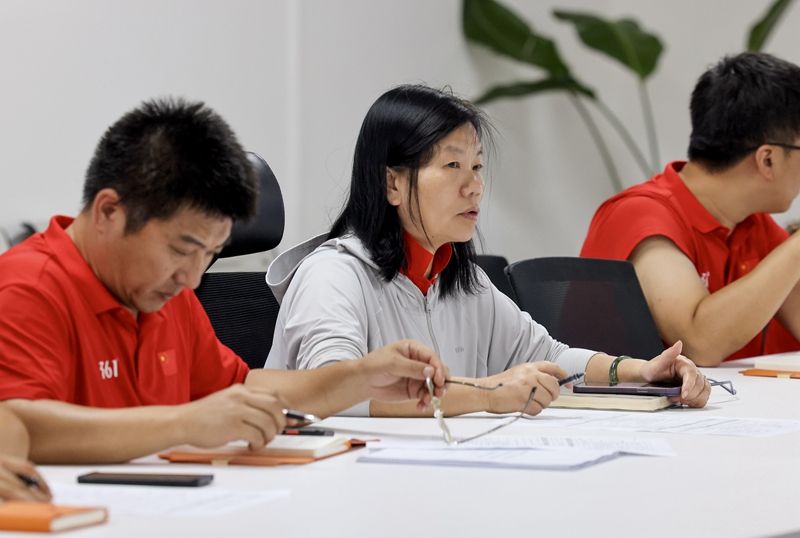 褚崇英(中)帶領團隊主要負責亞運村技術官員村的住宿服務、物業服務及工程保障。受訪者供圖
