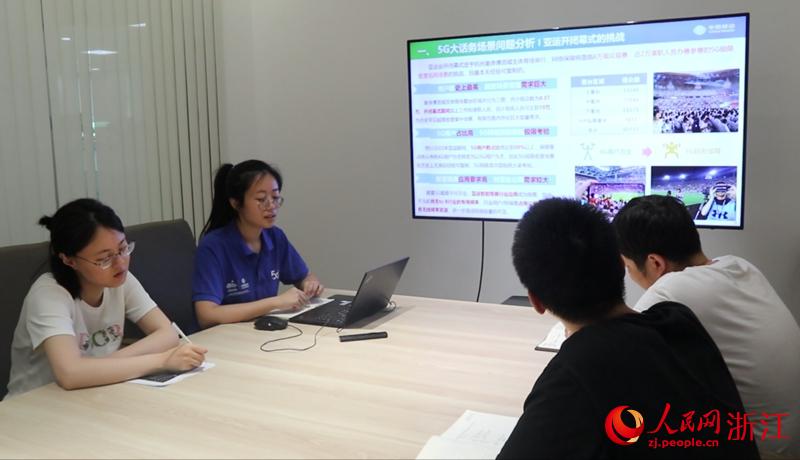 杭州亞運村運行團隊餐飲服務中心副主任胡傳剛(右一)和團隊進行工作復盤。人民網 秦銘澤攝