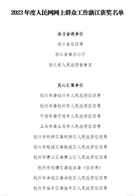 浙江省“2023年度人民網網上群眾工作民心匯聚單位”出爐