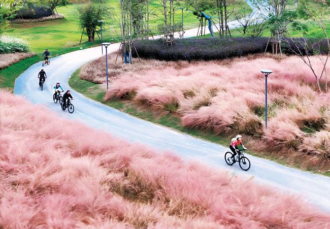 10月26日,在金華市婺城區郭力壟水庫周邊綠道,騎行愛好者穿過大片粉黛亂子草。層層疊疊的粉色花穗連綿起伏,在風中輕盈搖曳,綠道邊的花花草草,與水庫的碧波、草坪的翠綠相互映襯。據了解,郭力壟水庫周邊綠道是一條集運動、親子、休閑于一體的郊野型觀景綠道,起點位于白沙溪和馬海大橋交叉口,終點位于古方村,全長24.6公里。近年來,婺城大力推進綠道建設,目前已建成城市型、郊野型、濱水型等不同類型的綠道20多條,總長度超過250公里,讓更多婺城群眾享受品質生活。(吳潮宏)