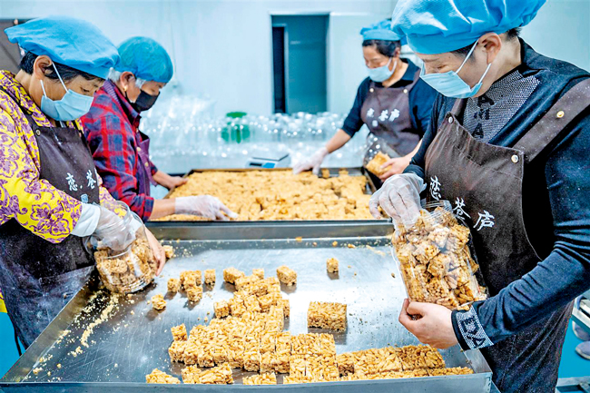 10月28日,在金華市婺城區瑯琊鎮一共富工坊,工人正加緊制作年糕糖,濃郁的炒年糕香與糖香撲鼻而來。